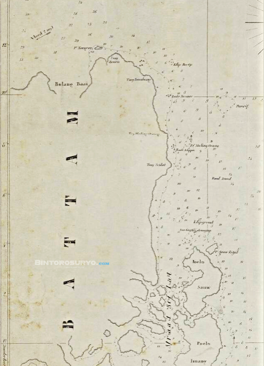 “Bollan Bay, lying to the westward of Tanjong Nongsa, is nearly 3 miles wide at its mouth, between Tanjong Treng on the East, and Tanjong Pengair on the West, and 2^ miles deep, narrowing towards its head. A detached reef lies at the entrance of Bullan Bay…“