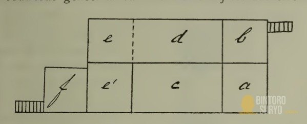 Dari tangga, seperti di gambar denah, kita masuk ke serambi (receiving room) yang lantainya lebih rendah dari ruangan loewa (ruang utama). Kalau kedua bagian ini satu lantai disebut kèlè anak. Lebih ke dalam, ada ‘dalam’ (ruang dalam) dengan serambi dalam di depannya, tempat tidur dan ruang wanita. Lantainya berbeda ketinggian dan lebih tinggi daripada dua ruangan pertama.